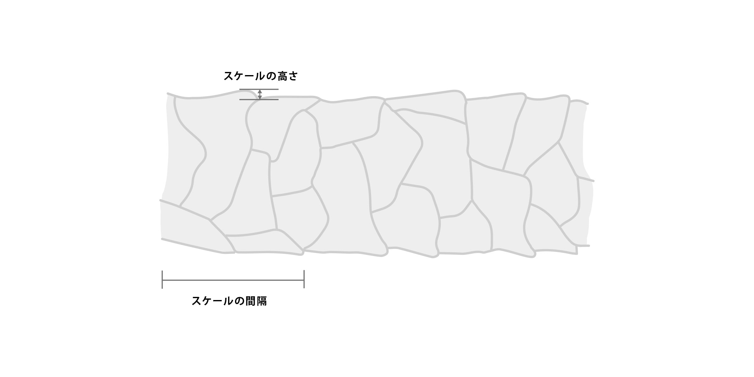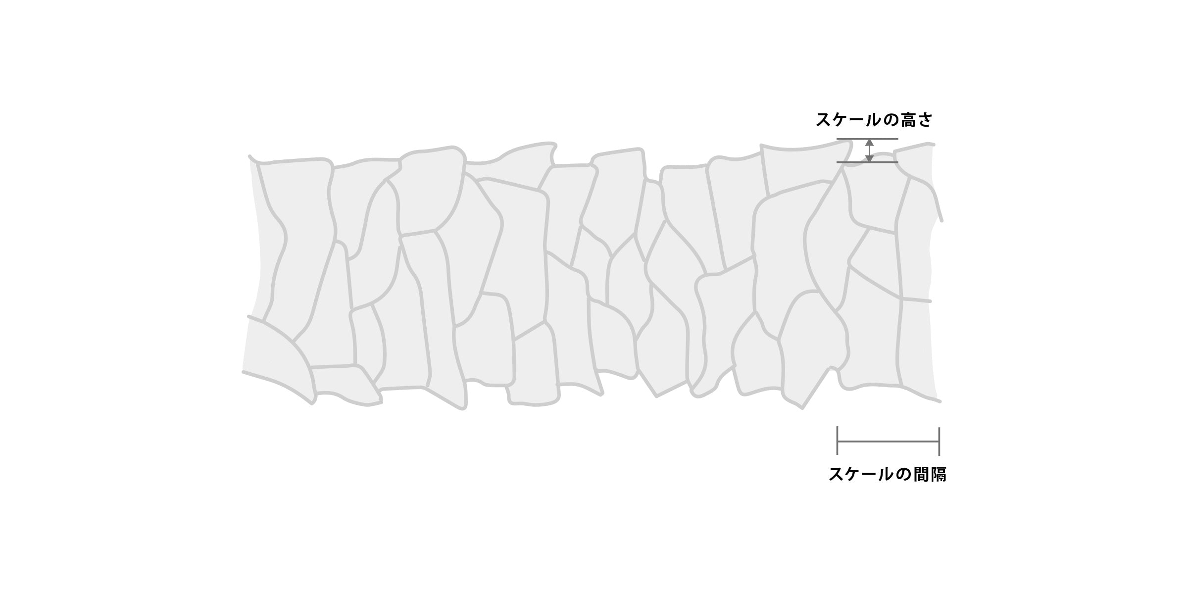 メリノオプティモと他のウールとの大きな違いは、「スケール」とよばれるウール特有のうろこ状の表皮にあります。スケールの間隔や高さが、いわゆる「チクチク感」につながる原因にもなりますが、メリノオプティモの場合は、一般的なウールと比べて、スケールとスケールの間隔が「広く」、かつスケールの高さが「低い」という傾向が見られます。